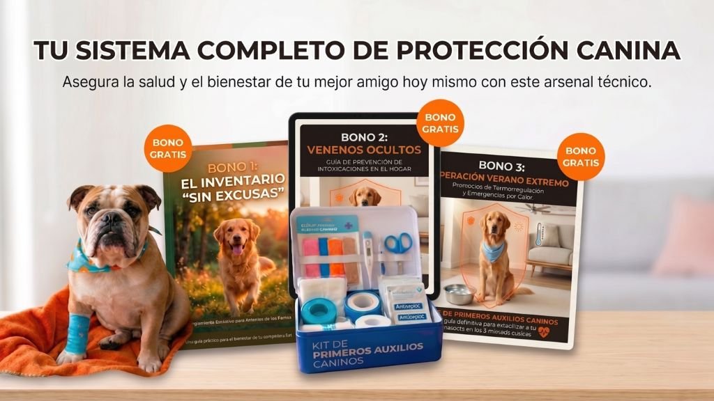 Hemos diseñado este sistema para que no tengas que pensar, solo ejecutar. Al adquirir hoy el Kit de Primeros Auxilios Caninos, recibes acceso inmediato a la formación principal y a 3 herramientas técnicas de regalo.